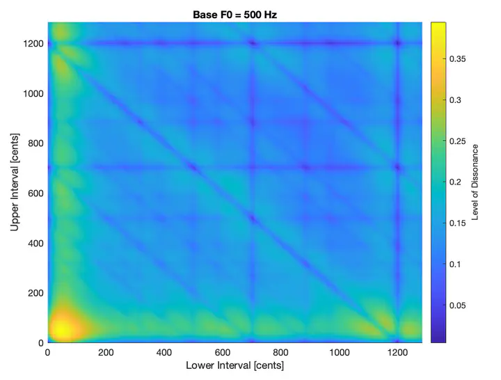 Fourth, the same principle can be now applied to three tones with seven overtones each - one is stationary, and the other two form a lower and a higher interval. The more yellow the curve, the more dissonant is the triad accord. Some of the blue dips are in good accordance with consonant chords, such as the major triad at (400,300).