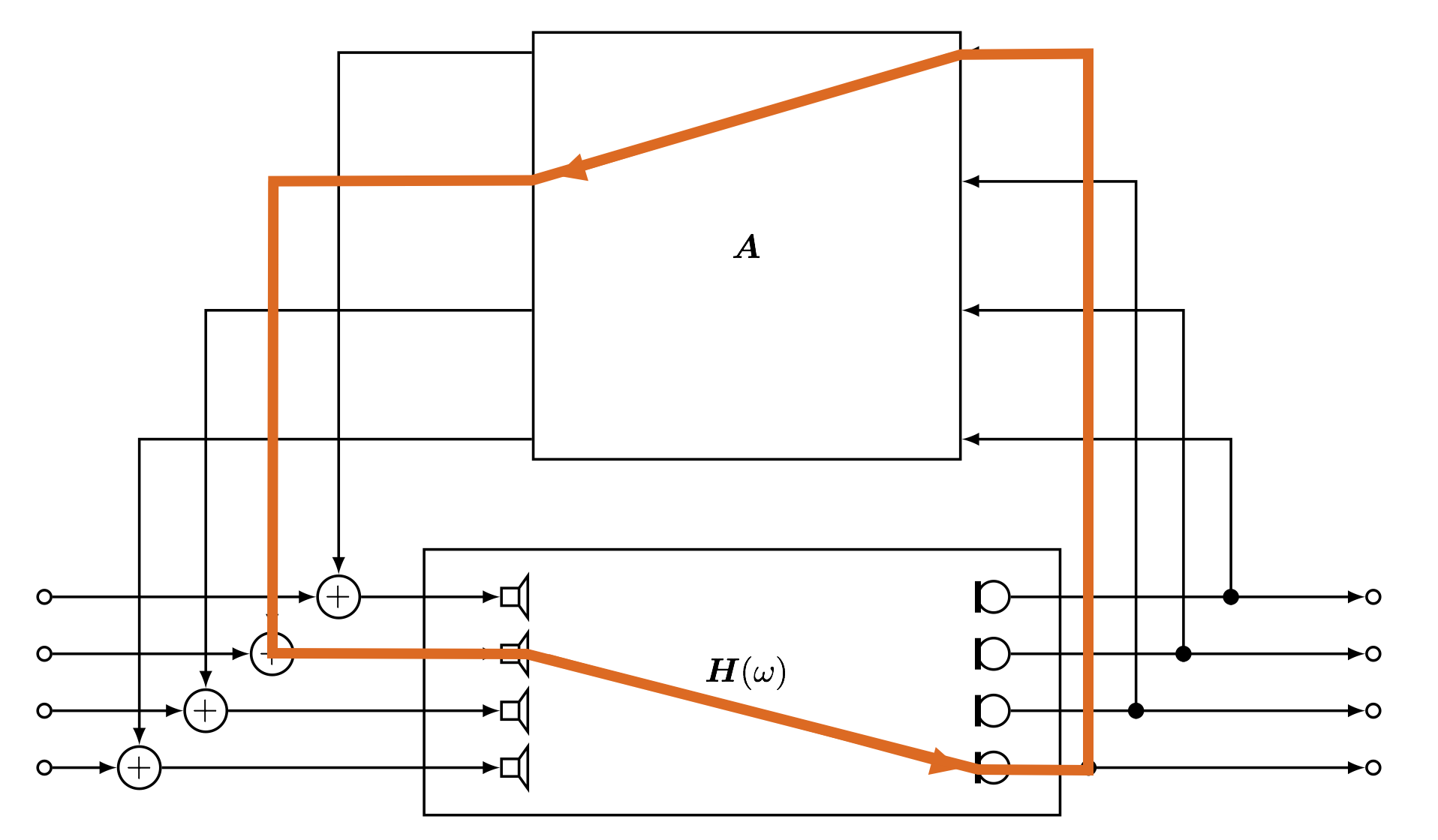 Figure 2: A reverberation enhancement system (RES) with four microphones and four loudspeakers. The microphones are coupled to the loudspeaker via a feedback matrix $\mathbf{A}$. If the feedback gain is too high, a positive feedback loop (in orange) can destabilize the RES. This so-called Larsen effect often results in loud and unpleasent ringing tones.